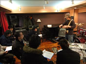 教室外での特別セミナーの様子です。奏法の解説をしています。